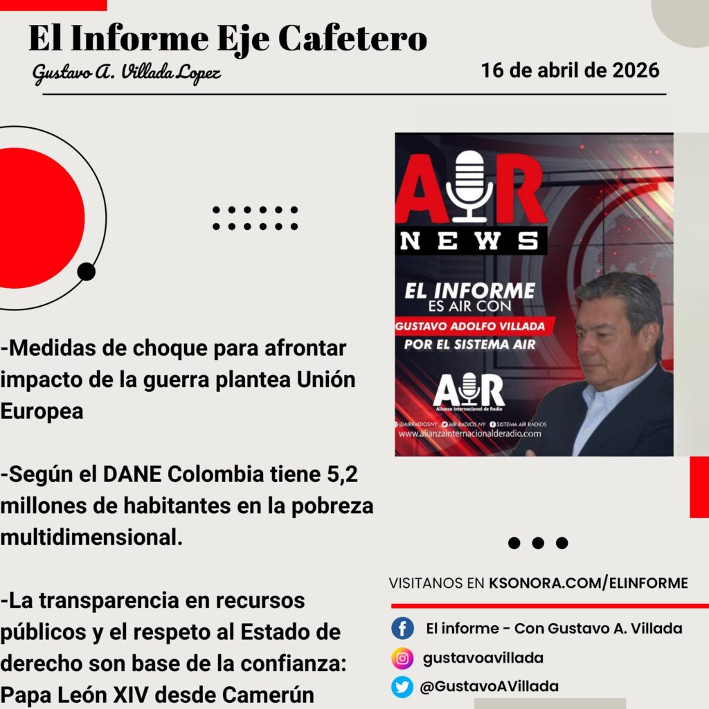 -Medidas de choque para afrontar impacto de la guerra plantea Unión Europea -Según el DANE Colombia tiene 5,2 millones de habitantes en la pobreza multidimensional. -La transparencia en recursos públicos y el respeto al Estado de derecho son base de la confianza: Papa León XIV desde Camerún