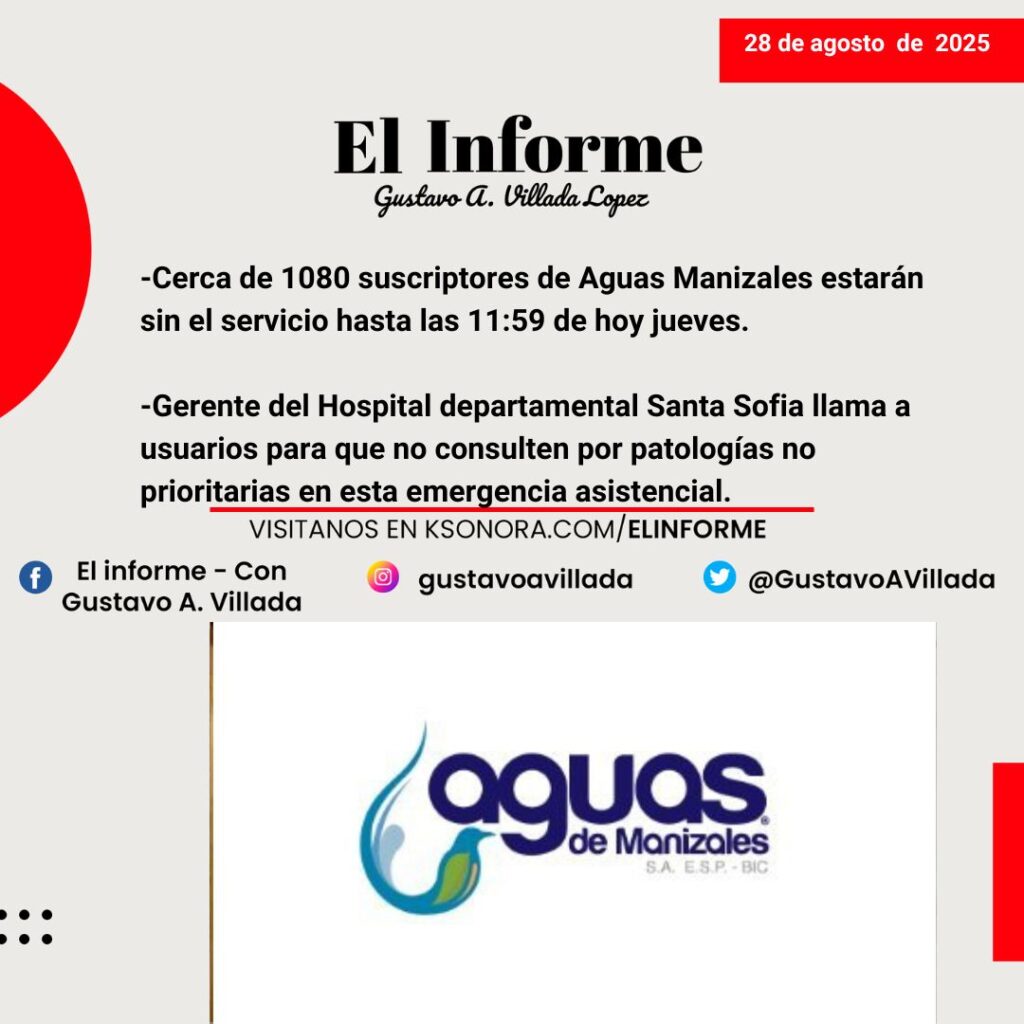 -Cerca de 1080 suscriptores de Aguas Manizales estarán sin el servicio hasta las 11:59 de hoy jueves.