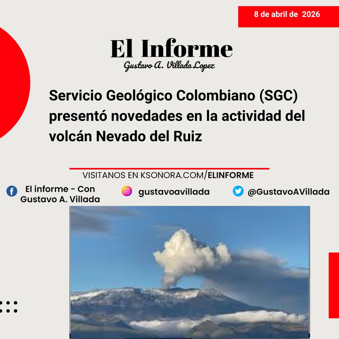 PRESIONE SOBRE LA IMAGEN PARA LEER LA NOTA COMPLETA… Servicio Geológico Colombiano (SGC) presentó novedades en la actividad del volcán Nevado del Ruiz El Servicio Geológico Colombiano (SGC) informó sobre el seguimiento de la actividad del volcán Nevado del Ruiz, durante el periodo 31 de marzo y el 6